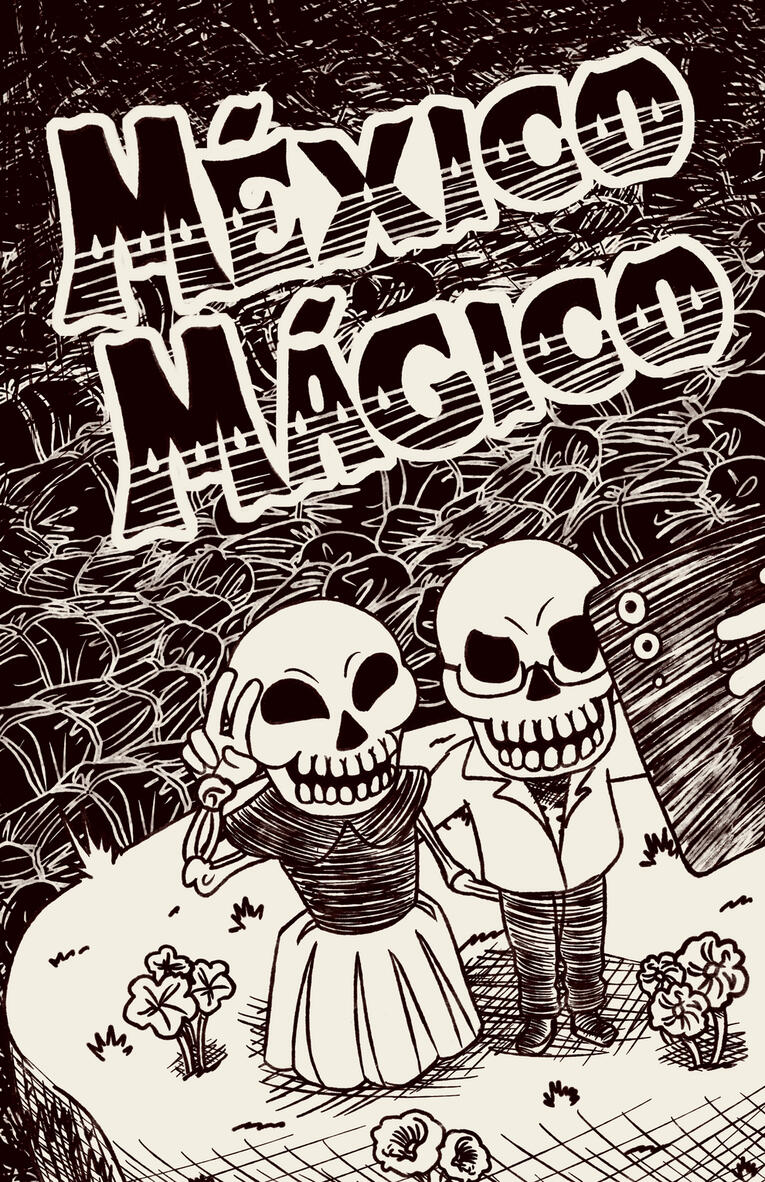 “México Mágico” is a satire illustration where the other way that said expression is used in the country is visually represented, in addition to showing a real situation that seems surreal. The poster shows two skulls taking a photo in a field of flowers, but in the background you can see a pile of corpses in a bag. The above represents the current state and the bad taste situation in the country. This Illustration was part of the Calavera school project.