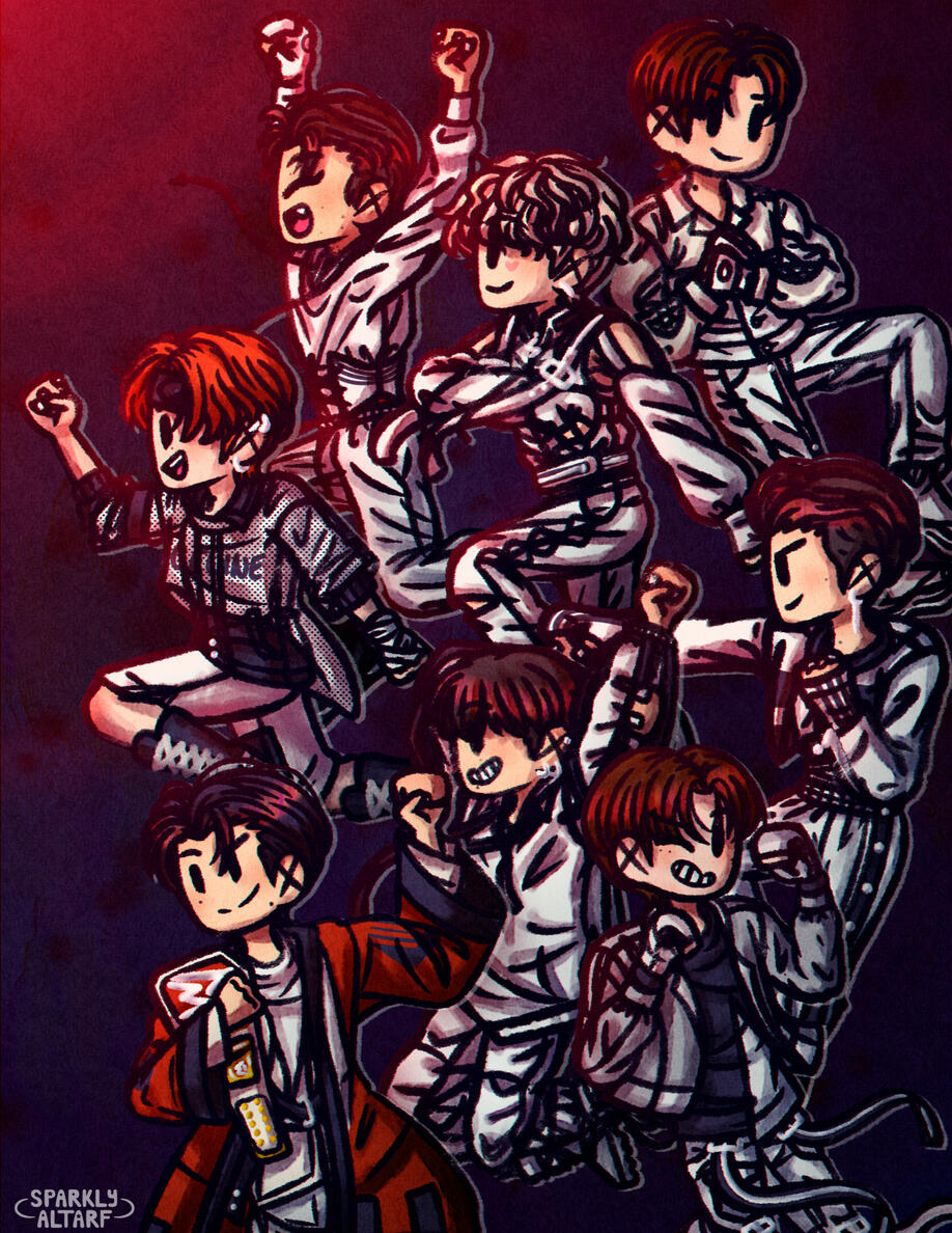 Illustration made in collaboration with other artists to create a fanzine compilation of all the art made in celebration of the 5th Anniversary of the kpop band Ateez. A project by fans for fans.